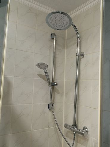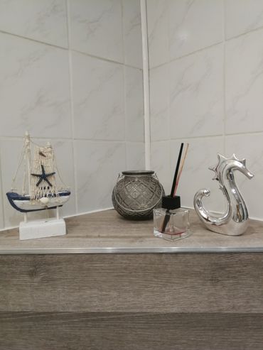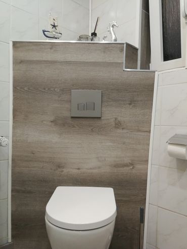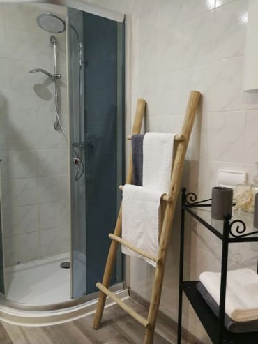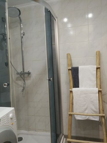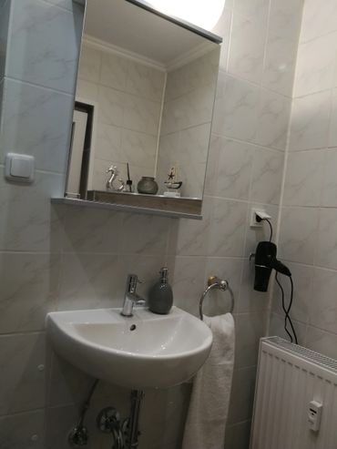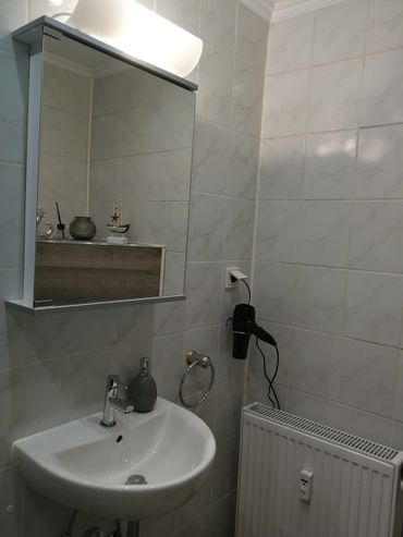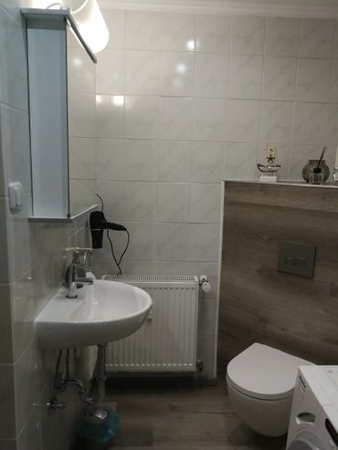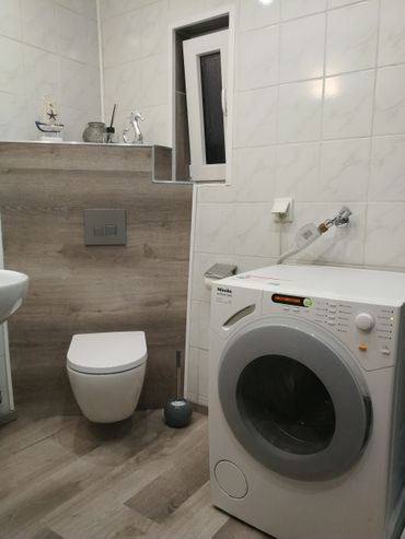 Das Bad ist wandhoch gefliest und hat ein Außenfenster. Ein Spiegelschrank, ein Föhn, diverse andere Badutensilien sowie eine Waschmaschine gehören zur Ausstattung. Handtücher in "Hotelqualität" werden in ausreichender Menge zur Verfügung gestellt. Auf einen hygienisch einwandfreien Zustand legen wir besonderen Wert.